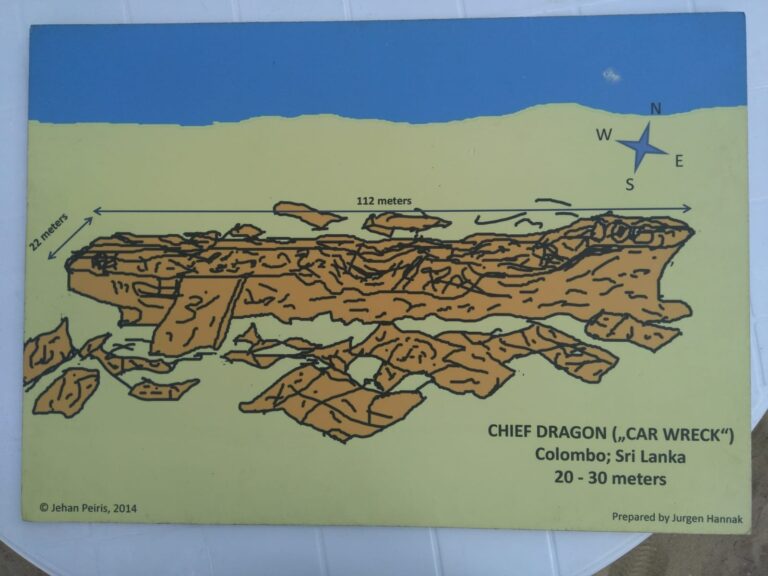The Chief Dragon Shipwreck, also known as the Car Carrier, is a colossal and majestic wreck located off the coast of Colombo, Sri Lanka. This site lies approximately 15.94 kilometers offshore, with an average boat travel time of about 50 minutes. Sitting at depths between 20 and 32 meters, the wreck is best suited for Advanced Open Water Divers and is compatible with Nitrox (Nx 32). Though penetration is not possible, the site offers incredible swim-throughs and scenic underwater views, making it ideal for both recreational divers and underwater photographers. Originally known as the MV Chief Dragon, the vessel was lost in April 1983 due to a fire on the deck. Measuring 113 meters in length, 23 meters in width, and 8 meters in height, the wreck now rests upright on the seabed, surrounded by pristine blue waters. Divers can explore the captivating bow and stern areas, where large vehicle chassis and wheel axles still remain — haunting relics of its past as a car carrier. Over time, the wreck has transformed into a thriving marine habitat, heavily encrusted with colorful corals and sponges. Schools of reef fish dart through its framework, while pelagic species such as Great Trevallies, Tunas, Barracudas, and Napoleon Wrasses are frequently spotted cruising nearby. The Chief Dragon offers a mesmerizing blend of maritime history, marine life, and underwater beauty, earning it a reputation as one of Colombo’s most awe-inspiring dive sites.