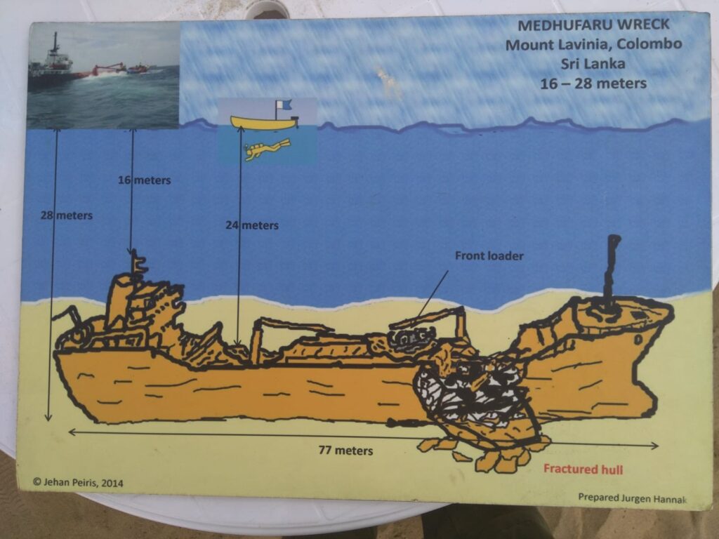 The Medhufaru Shipwreck is one of Colombo’s most popular and visually stunning dive sites, located approximately 6.26 kilometers offshore and accessible by boat in around 15 minutes. Resting upright at a maximum depth of 28 meters, this wreck is ideal for Advanced Open Water Divers and is suitable for Nitrox (Nx 32). Known for its photogenic structure and rich marine life, it’s a favorite among underwater photographers and videographers. The site offers exciting opportunities for wreck exploration and penetration, with advanced divers able to navigate the staircase and wheelhouse areas. Originally known as the MV Medhufaru, the vessel sank in 2009 due to loss of structural integrity. Measuring 72 meters in length and 12 meters in width, the wreck sits upright on the seabed, with its intact wheelhouse and staircase inviting divers to explore. The site bursts with marine biodiversity — schools of fusiliers swirl around the bow, while moray eels, octopus, friendly batfish, triggerfish, stingrays, and occasional reef or whale sharks make this wreck a lively underwater ecosystem. Macro life is also abundant, adding to its photographic charm.
