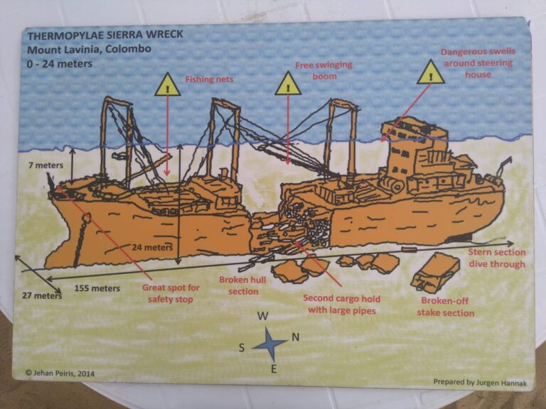The Thermopylae Sierra Shipwreck is one of Colombo’s most iconic dive sites, located about 7.18 kilometers offshore and reachable by boat in approximately 15 minutes. Resting at a maximum depth of 24 meters, this fascinating wreck is suitable for Open Water Divers and is also compatible with Nitrox (Nx 32). The site offers opportunities for photography and videography, and advanced divers can explore deeper penetration areas with the guidance of experienced instructors. Originally known as the MV Thermopylae Sierra, the vessel sank on 23rd August 2012 due to damage and undermaintenance. Measuring 155 meters long, 27 meters wide, and 10 meters high, the wreck now serves as a thriving artificial reef teeming with marine life. Divers can explore its deck-level cabins, collapsed bridge, and underwater platforms, making it a true underwater playground. Today, the wreck is surrounded by a vibrant community of fish — shoals of fusiliers, large groupers, and even the occasional eagle ray or reef shark cruising in the blue. The site’s combination of accessibility, size, and marine biodiversity makes it a must-visit for both recreational and advanced divers. With a 4-star Island Scuba rating, the Thermopylae Sierra promises an unforgettable underwater experience filled with adventure, history, and natural beauty.